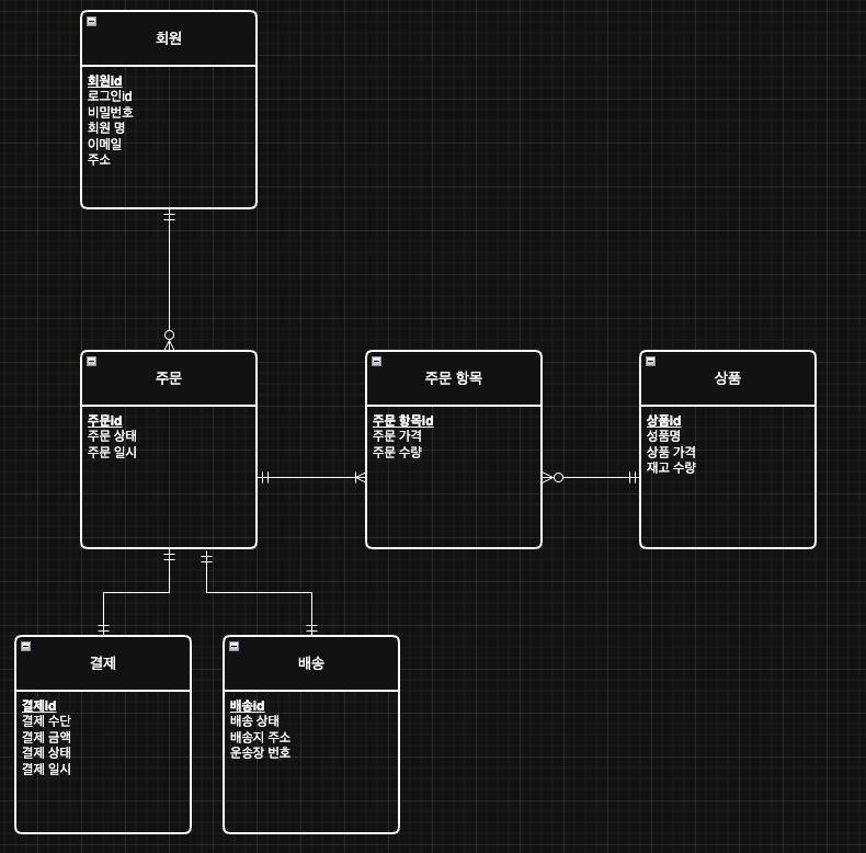 회원과주문의 관계: 1:N주문과결제의 관계: 1:1주문과배송의 관계: 1:1주문과상품의 관계: M:N