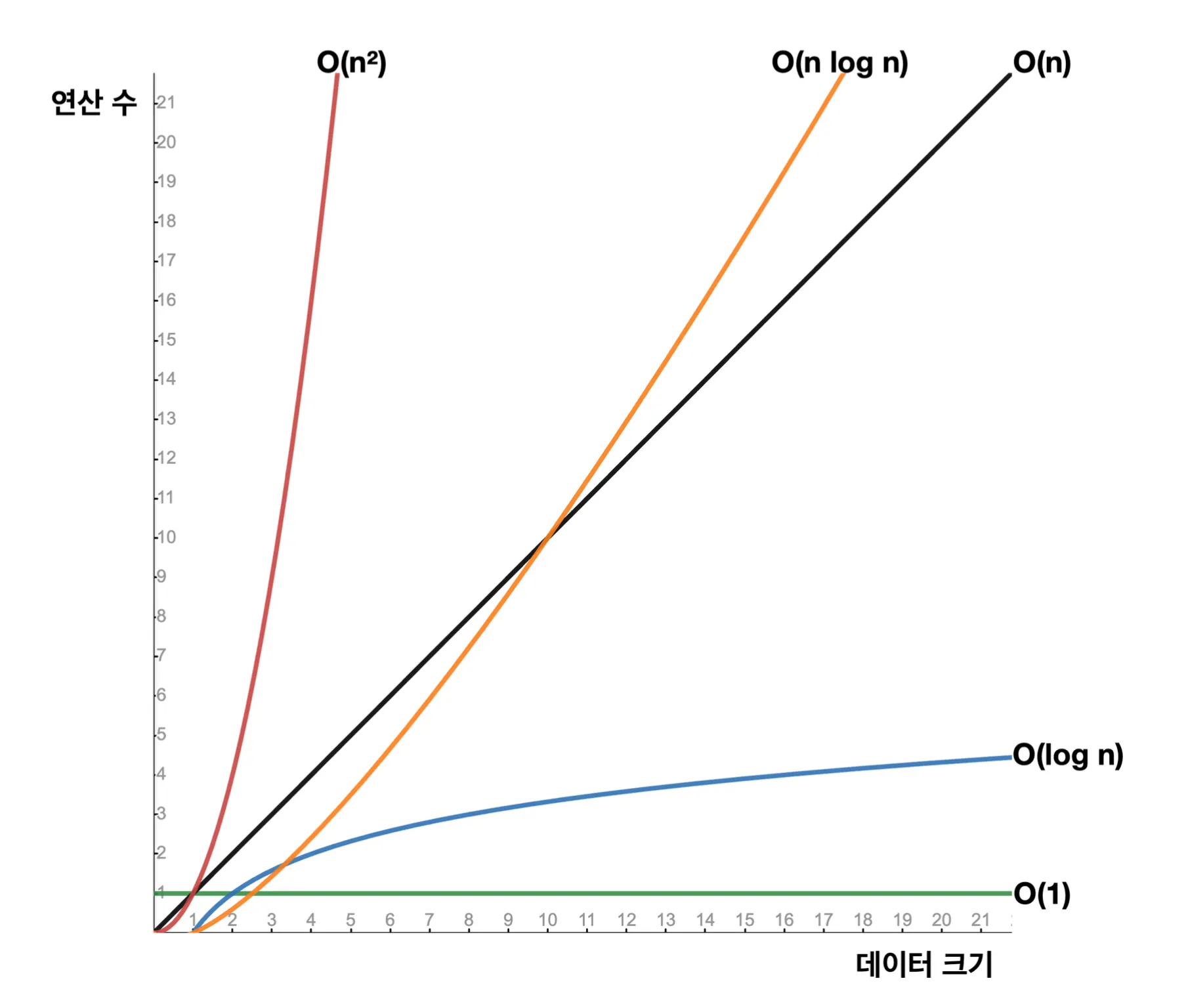 O(1)- 상수 시간: 입력 데이터의 크기에 관계없이 알고리즘의 실행 시간이 일정- ex) 배열에서 인덱스를 사용하는 경우