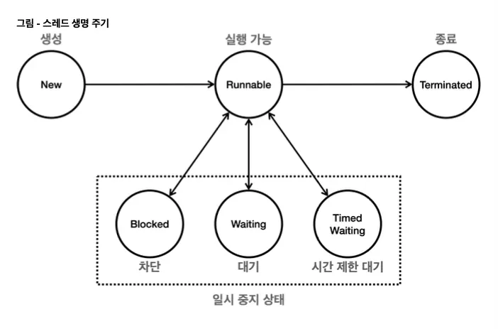New: 스레드가 생성되었으나 아직 시작되지 않은 상태Runnable: 스레드가 실행 중이거나 실행될 준비가 된 상태Blocked: 스레드가 동기화 락을 기다리는 상태Waiting: 스레드가 무기한으로 다른 스레드의 작업을 기다리는 상태Timed Waiting: 스레드가 일정 시간 동안 다른 스레드의 작업을 기다리는 상태Terminated: 스레드의 실행이 완료된 상태