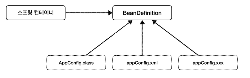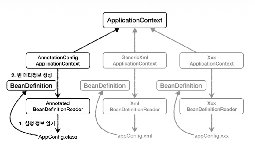 AnnotationConfigApplicationContext는AnnotatedBeanDefinitionReader를 사용해서AppConfig.class를 읽고BeanDefinition을 생성GenericXmlApplicationContext는XmlBeanDefinitionReader를 사용해서appConfig.xml설정 정보를 읽고BeanDefinition을 생성