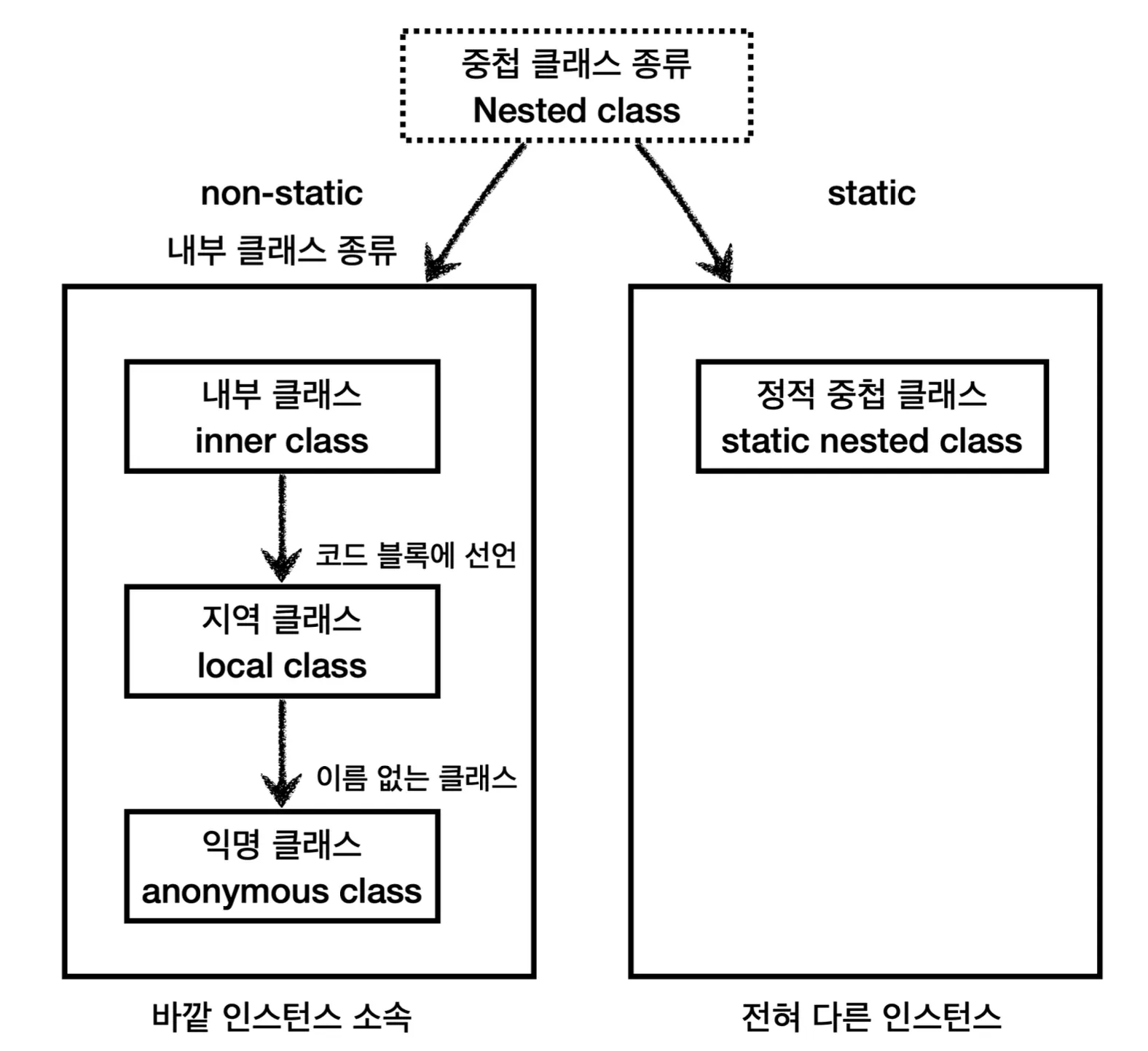 static이 붙음- 바깥 클래스의 인스턴스에 소속되지 않음