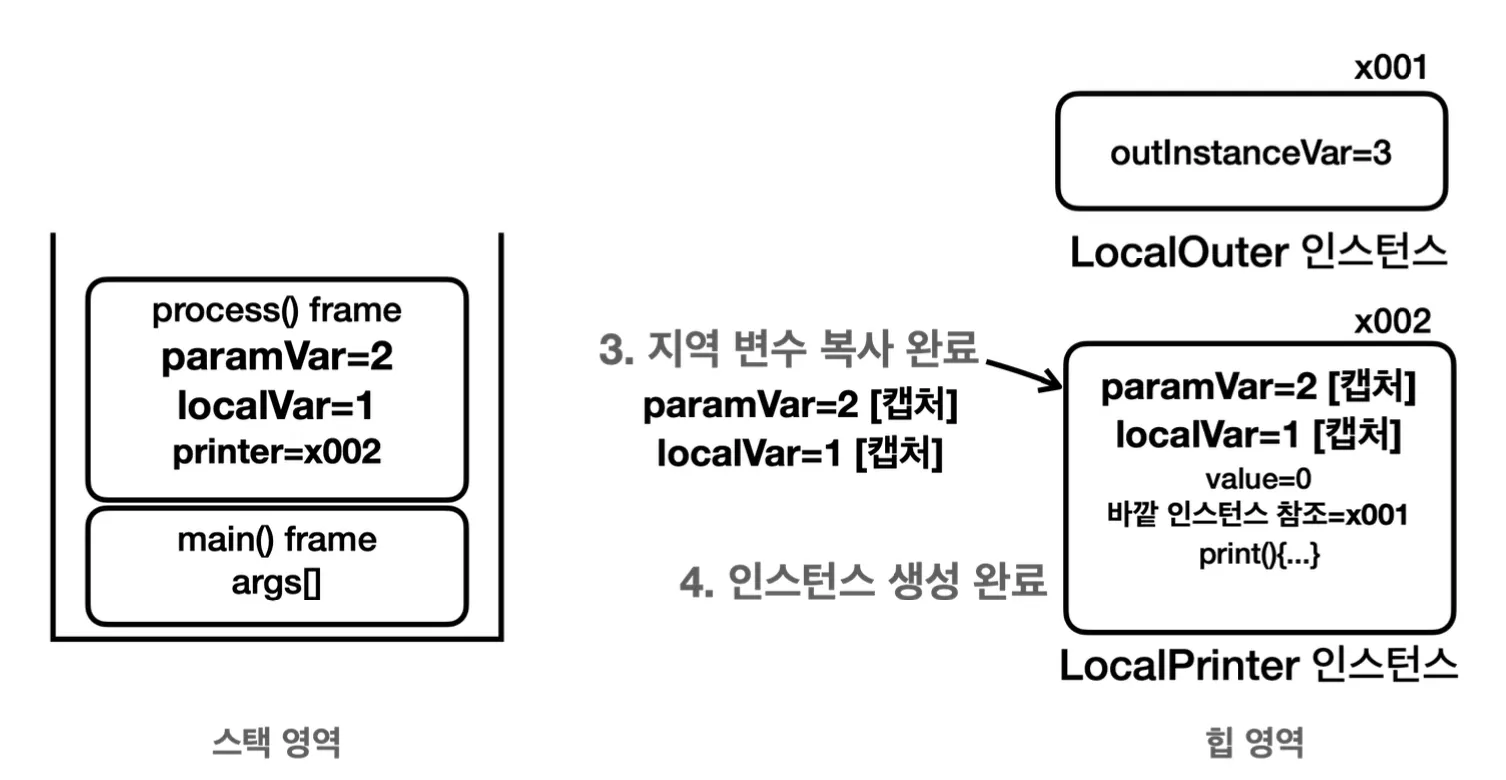 실행 결과 여전히 지역변수 값을 참조할 수 있습니다. 이는 지역 클래스가 객체를 생성할 때, 지역 변수를 캡처하기 때문에 일어나는 현상입니다.