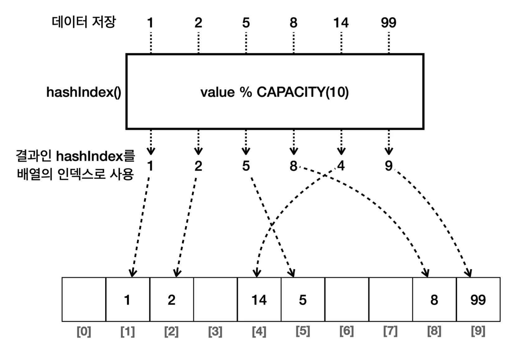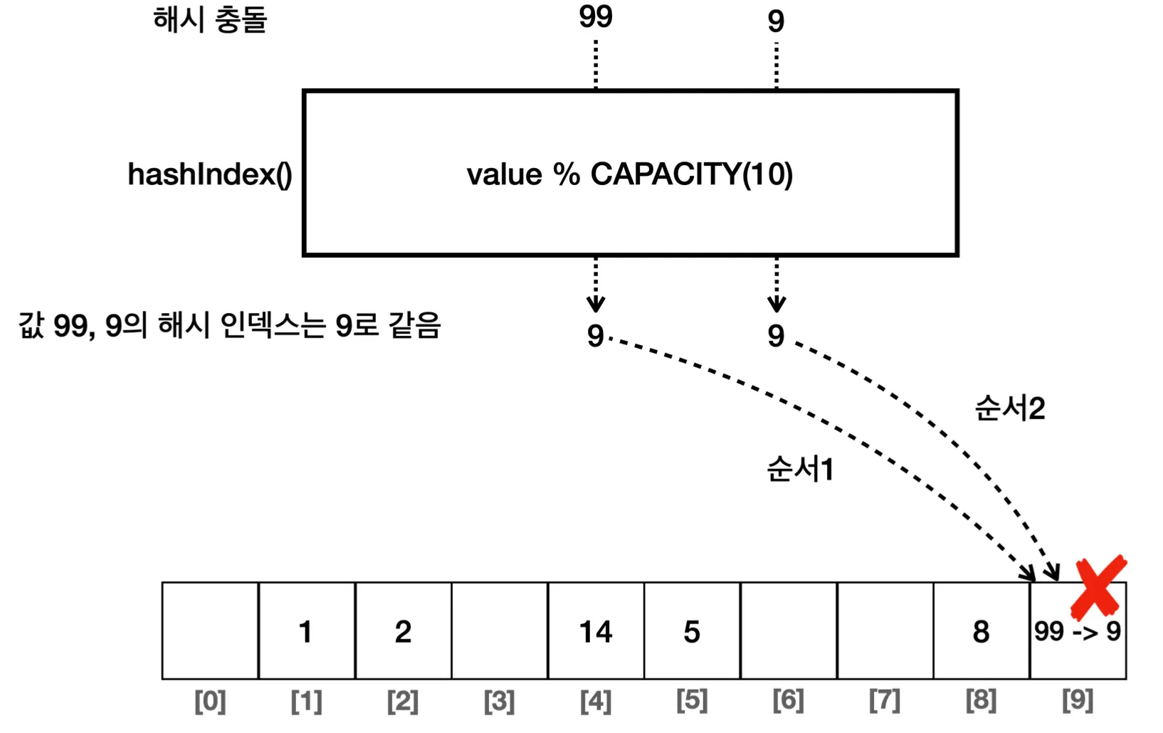 위 방식의 문제는 나머지 연산의 값이 동일하다면 같은 index가 나와 충돌한다는 것입니다.