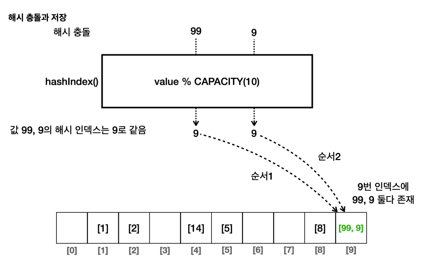 해시 충돌을 인정하고, 같은 공간에 또 다른 배열을 만들어 저장하도록 하여 이 문제를 해결할 수 있습니다.