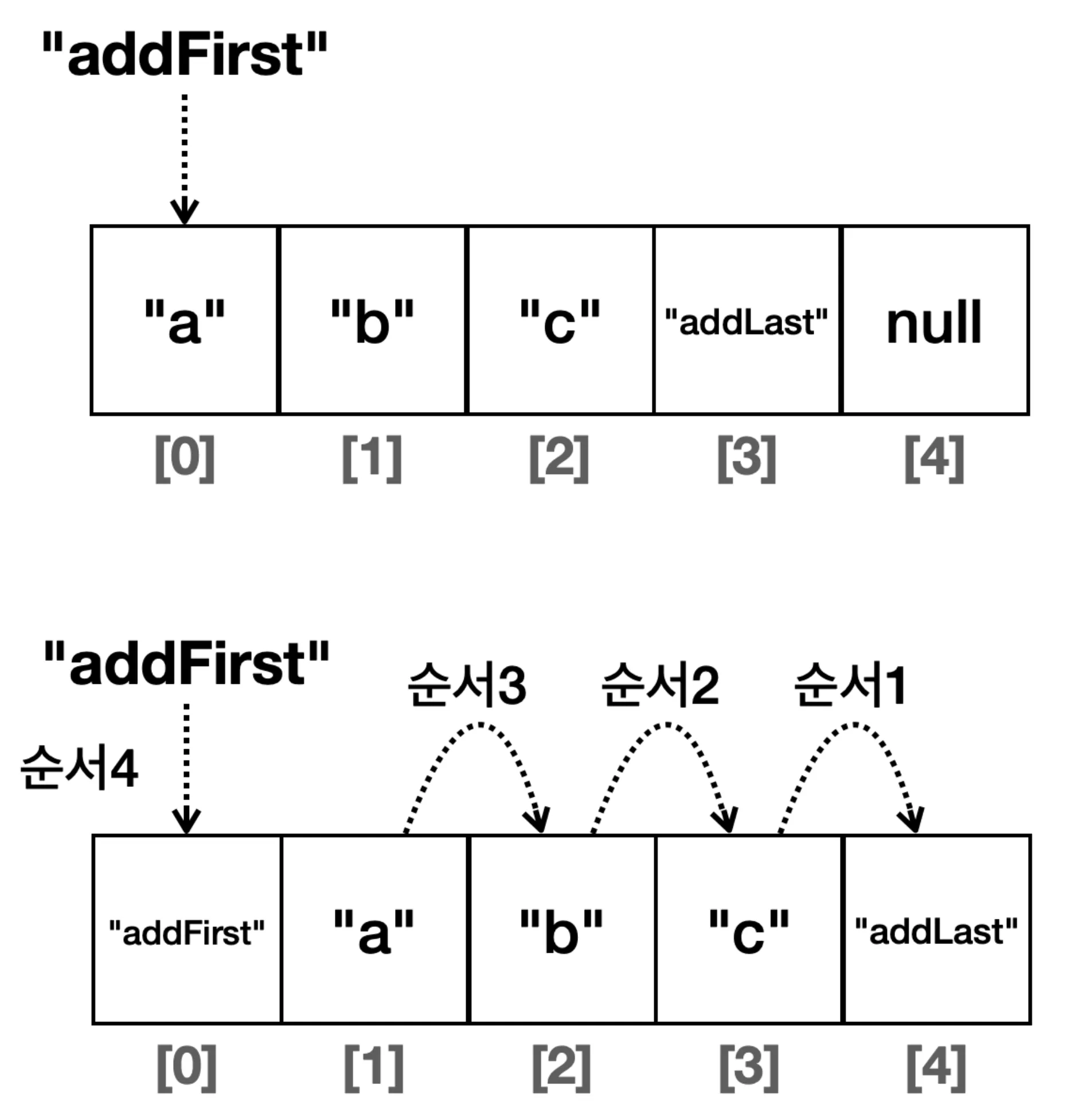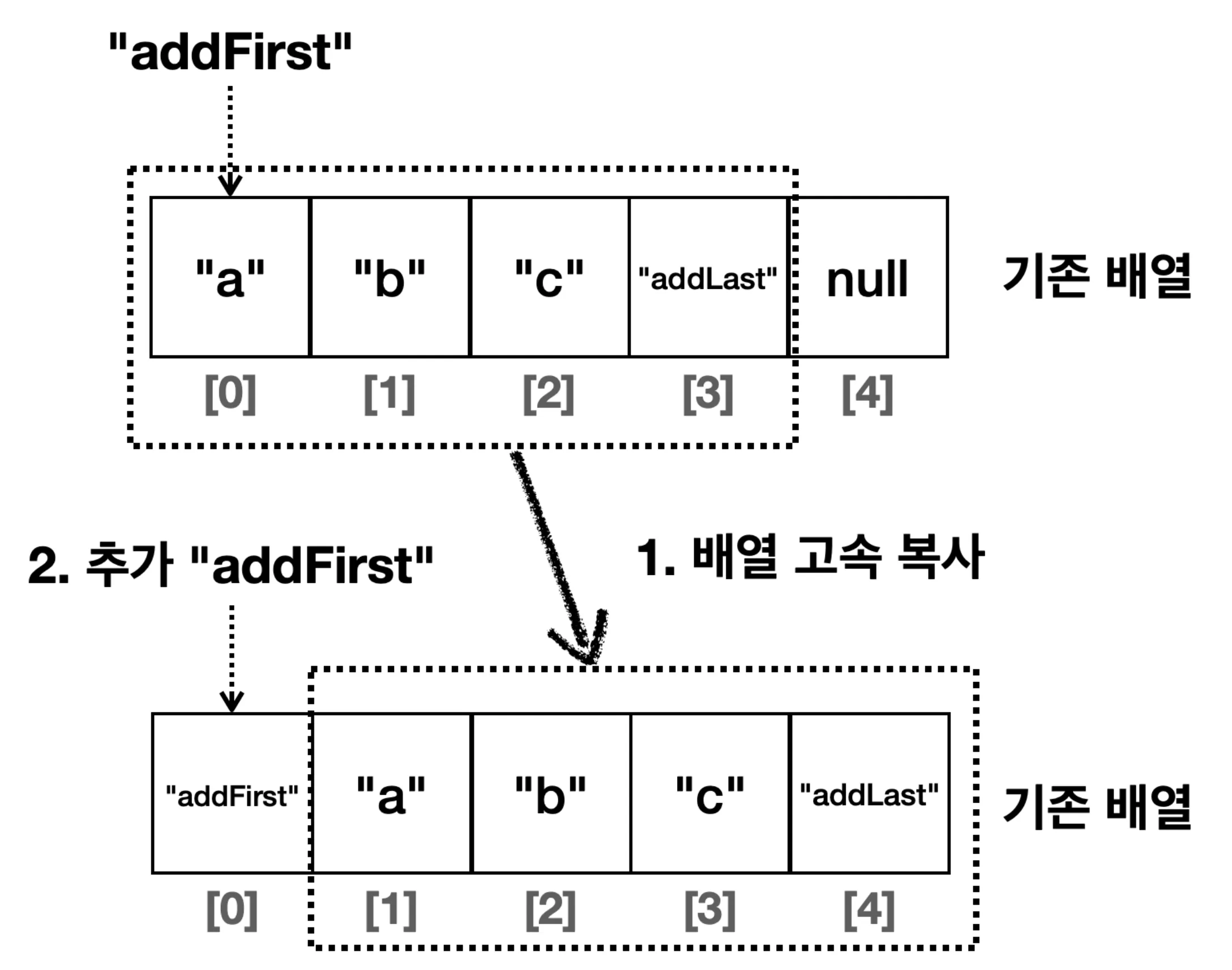System.arraycopy()를 이용하여 요소를 한 칸씩 이동 시키는 것을 최적화하여 비교적 빠르게 수행- 메모리 고속 복사 연산 사용